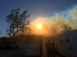Equestrian instructor Krista Belgum evacuating OVS horses as the flames loom closer. Photo by Stephanie Gustafson