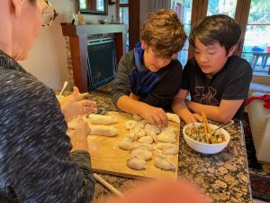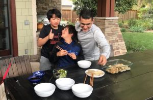 Peter, Arya, and Dr. S eat the dumplings they prepared together.