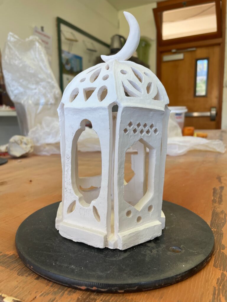 Her favorite piece right now represents Islam. She built a clay Ramadan lantern, which she does not have a question for yet. However, she thinks the meaning behind the piece may relate to fasting during Ramadan.