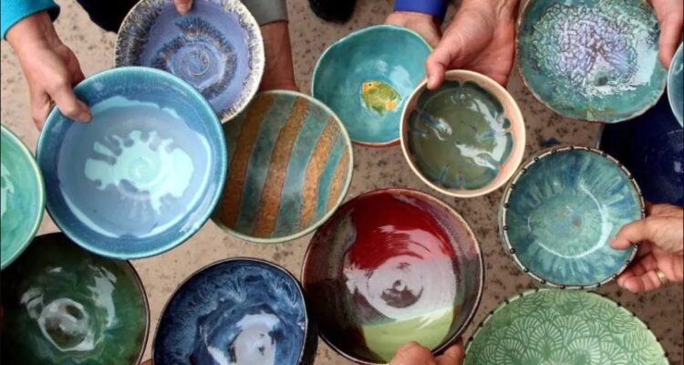 For Empty Bowls, artists make and donate bowls for sale at charitable events. The finished products are then used as serving pieces for a fundraising meal of soup and bread. Contributing guests get to keep the empty bowl as a reminder of all the other empty bowls that need filling.